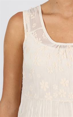 Top sans manches, col rond. Coupe évasée. Trois volants sous l'empiècement poitrine. Accompagné d'une doublure séparable à bretelles réglables.